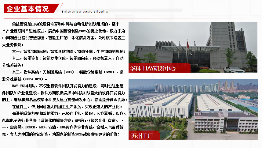 合益智能是由物流设备专家和中科院自动化所团队组成的,基于“产业互联网”思维模式,肩负中国智能制造2025的历史使命,致力于为中国制造业提供智慧物流、智能工厂的一体化解决方案,公司旗下设置 三大业务板块: